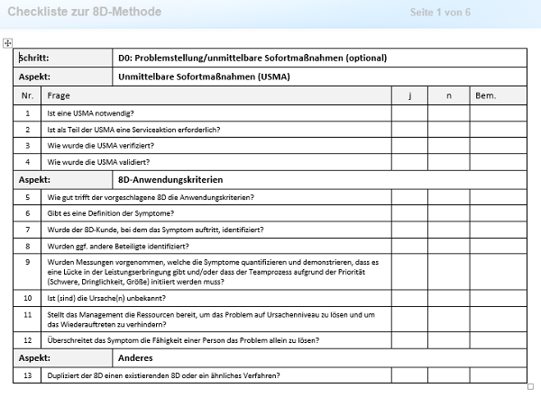 Als Problemlösungsprozess enthält diese Methode eine Abfolge von acht Schritten, die zu durchlaufen sind, sobald ein potenzielles oder auch tatsächliches Problem festgestellt wird. Richtig gehandhabt hilft dieses Instrument, eine rechtzeitige (schnelle) und vollständige Lösung des Problems zu finden.
