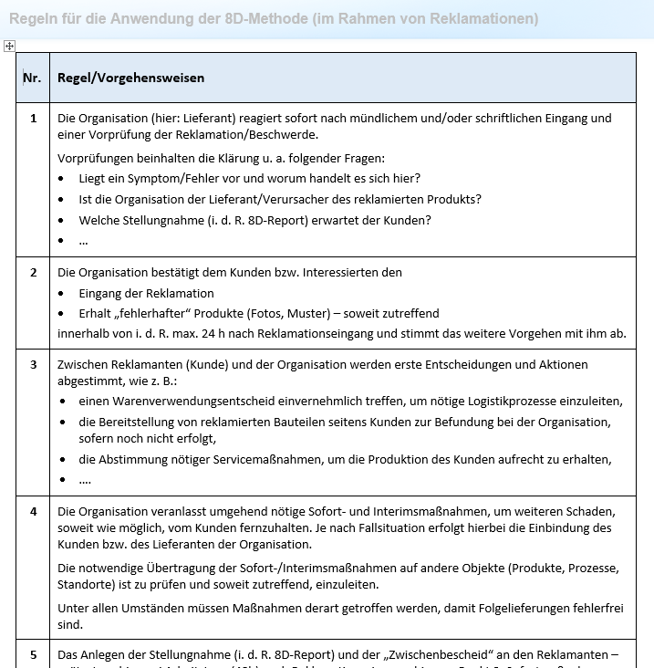 Für die sinnvolle Anwendung der 8D-Methode gelten – soweit zutreffend – insbesondere folgende Kriterien: