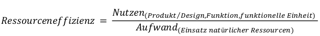 Die VDI 4800, Blatt 1, definiert Ressourceneffizienz als das Verhältnis eines bestimmten Nutzens oder Ergebnisses zum dafür nötigen Ressourceneinsatz [1]:
